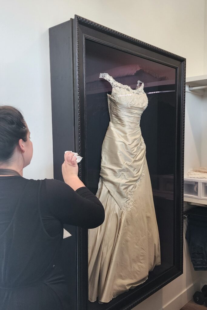 Throughout the mounting process, I kept the clients updated with progress photos. Showing them the steps—how the dress was sewn to the form, how the skirt was arranged against the glazing—helped them feel included and reassured. For a project with this much emotional weight, transparency was far better than a big reveal. Surprises are fun, but not when expectations are decades in the making.